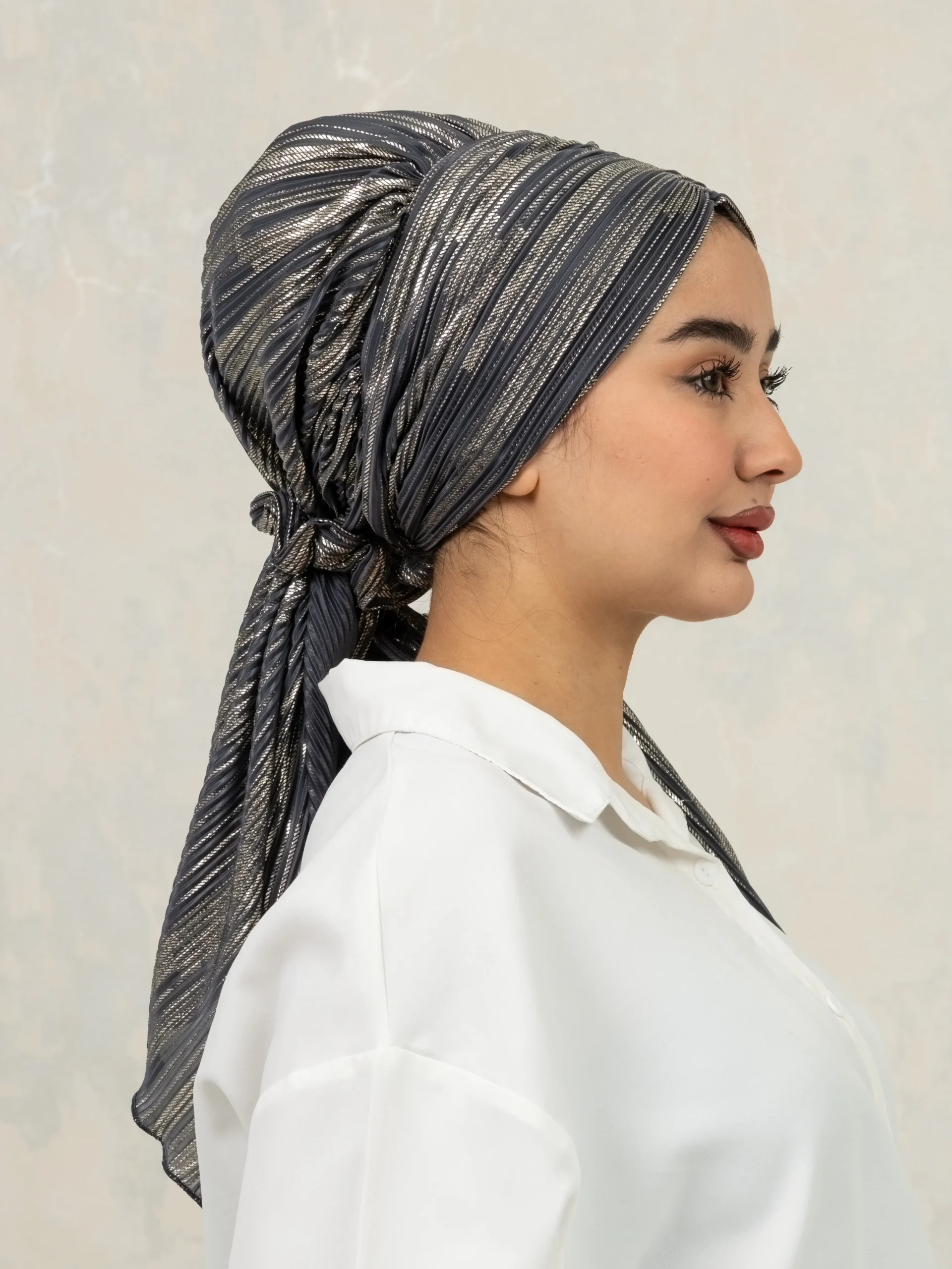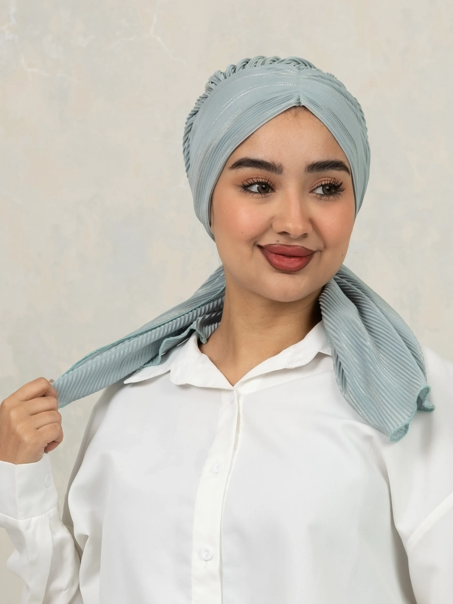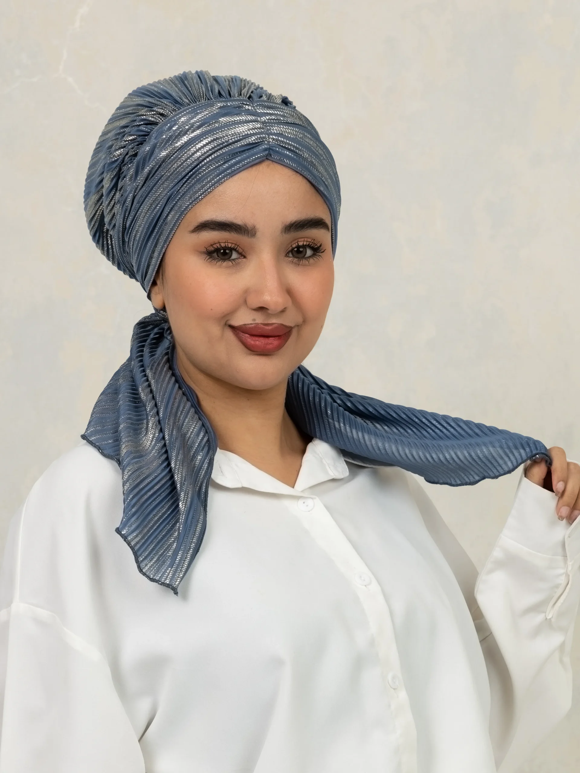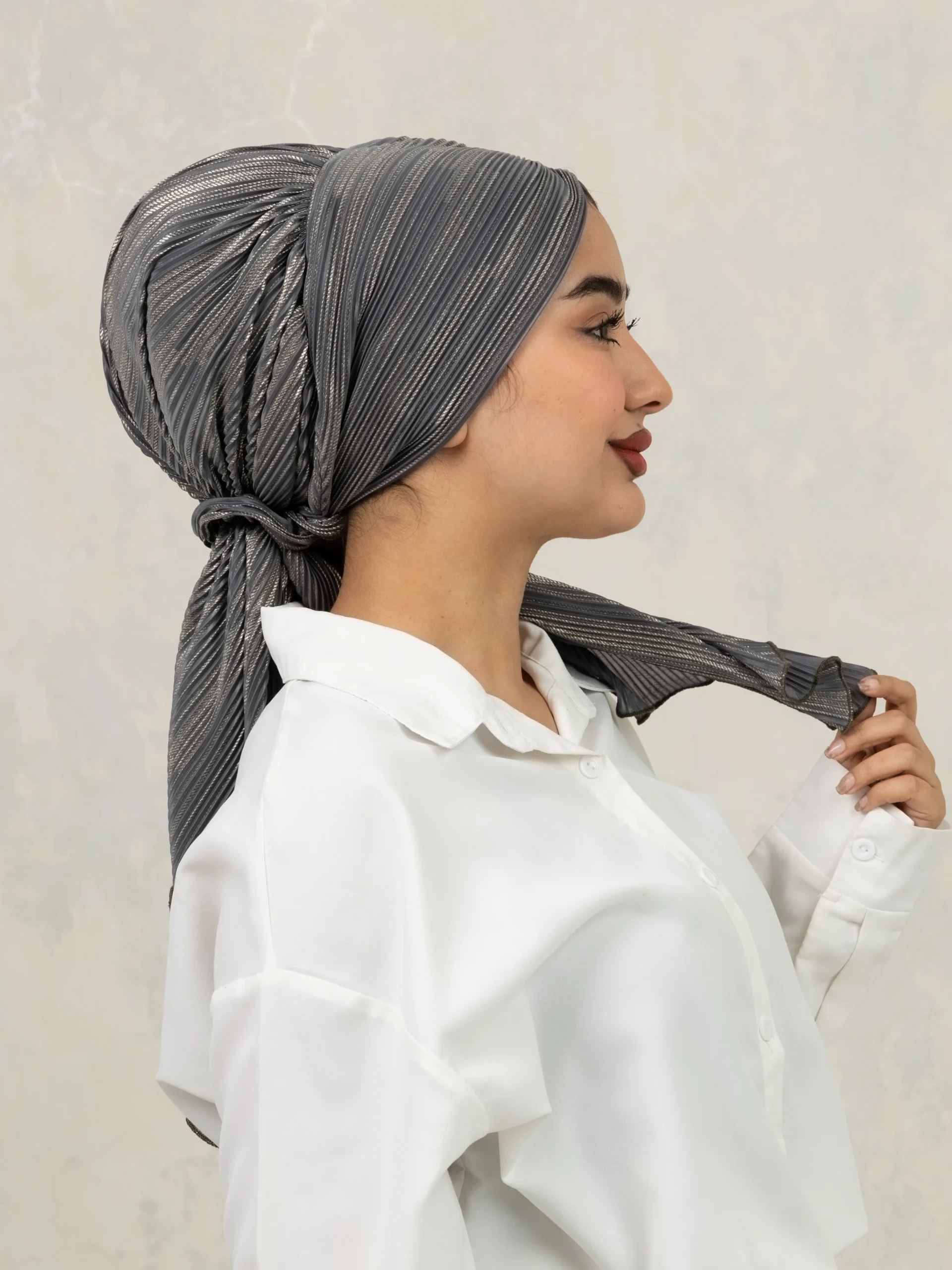 No-iron crinkle turban designed for effortless, ready-to-wear styling. Comes with scrunchie detail for easy bun making and can be styled in multiple versatile ways for everyday modest fashion.